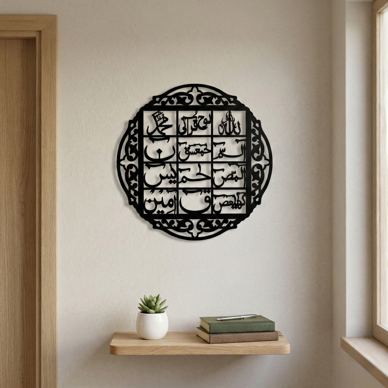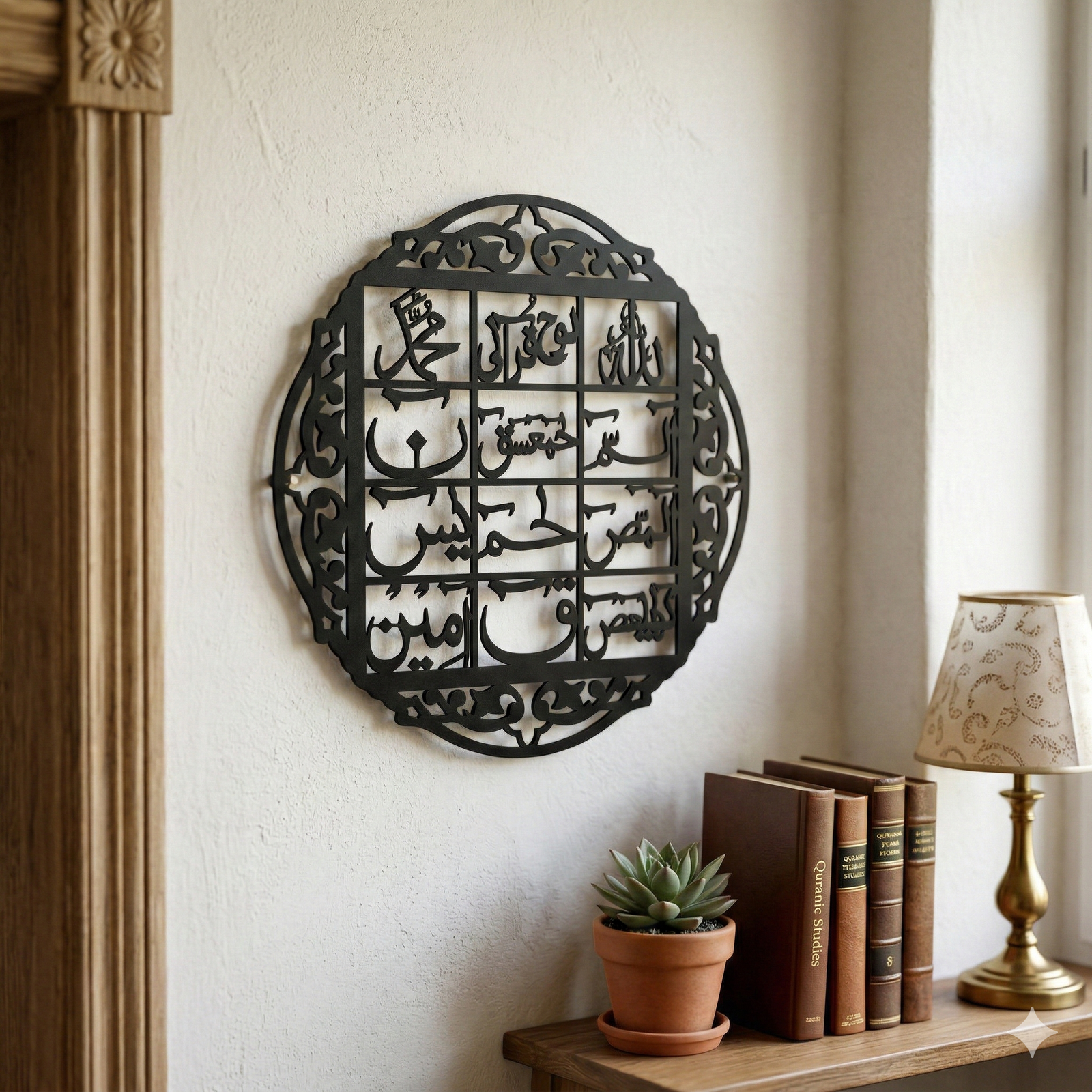 Mystical, protective, and spiritually profound — this Loh-e-Qurani Metal Wall Hanging brings the sacred “Disjointed Letters” of the Holy Quran into your living space. Expertly laser-cut from high-grade steel and finished in a premium matte black, this piece serves as a powerful spiritual anchor. The intricate calligraphic arrangement creates a stunning 3D shadow effect, turning any wall into a gateway of divine grace and contemplation.