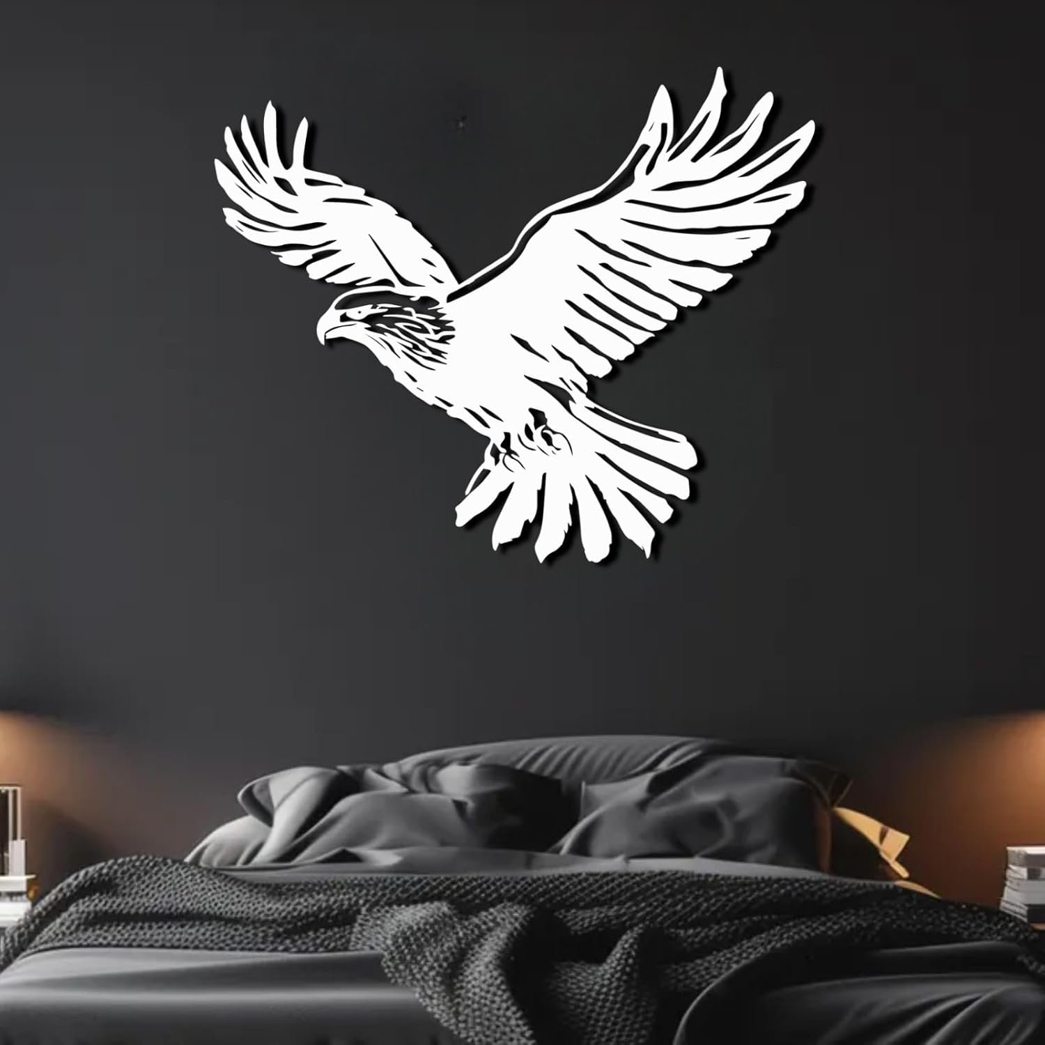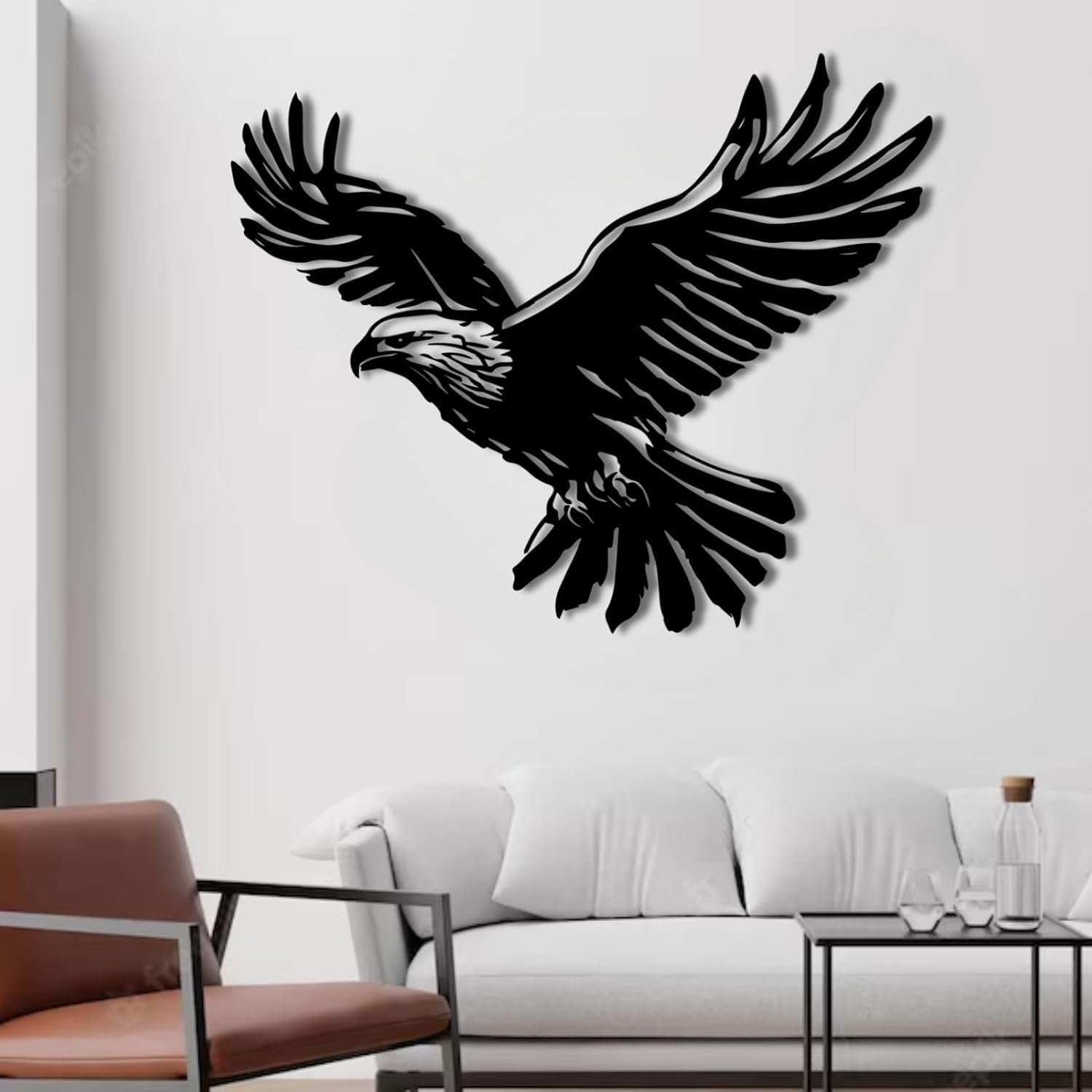 A bold symbol of strength and freedom, this Soaring Eagle Metal Wall Art is precision laser-cut from premium steel, creating a striking statement for any wall. Expertly laser-cut from high-quality steel, the design offers crisp edges, smooth curves, and a flawless matte black finish. The open-cut pattern allows light to pass through the wings, creating a dramatic three-dimensional shadow effect that enhances the presence of the piece.